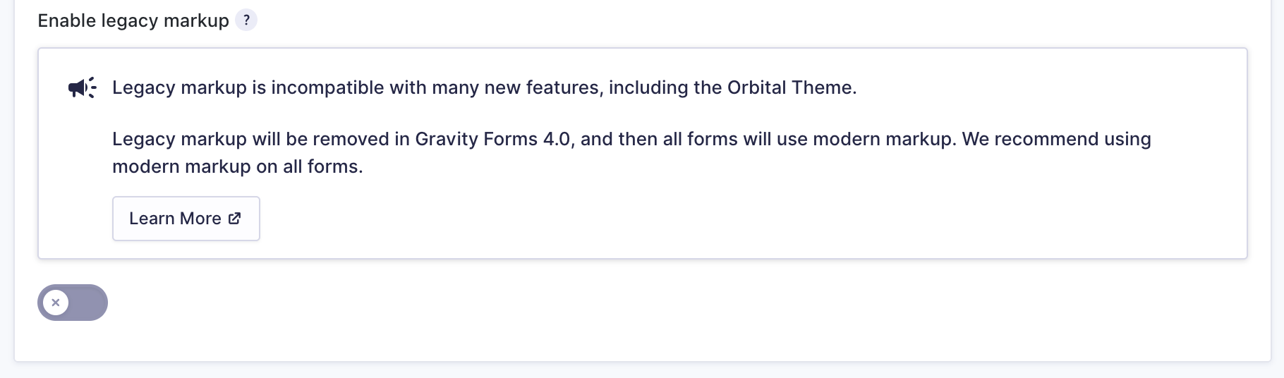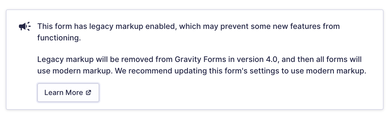 As such, forms continuing to use the legacy markup option will not have complete access to new features. Some features will require the newer markup to function. When legacy markup is enabled, you may also be presented with the following admin notice to warn you of this.