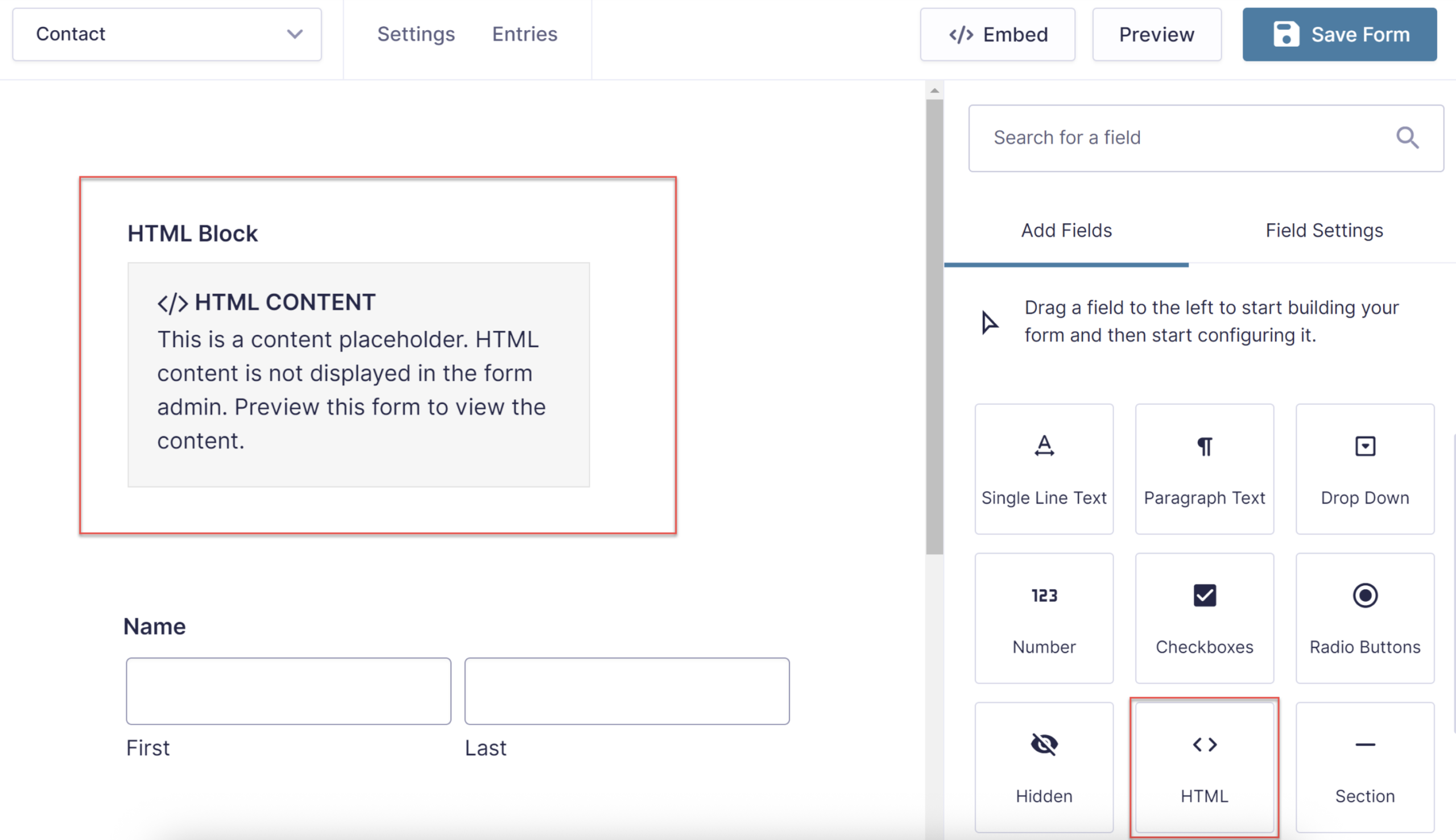 - Add an HTML field to your form where you want the content to appear.