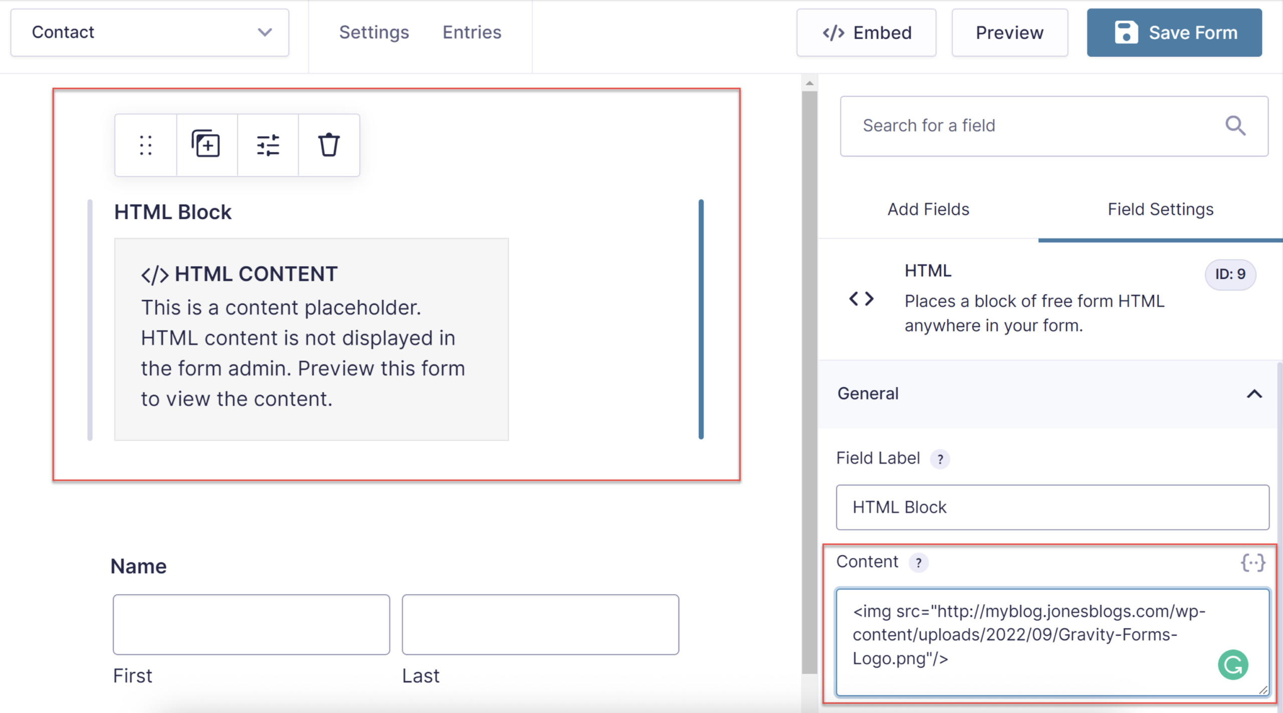 - Drag the HTML field to wherever you want the image to appear in your form.
