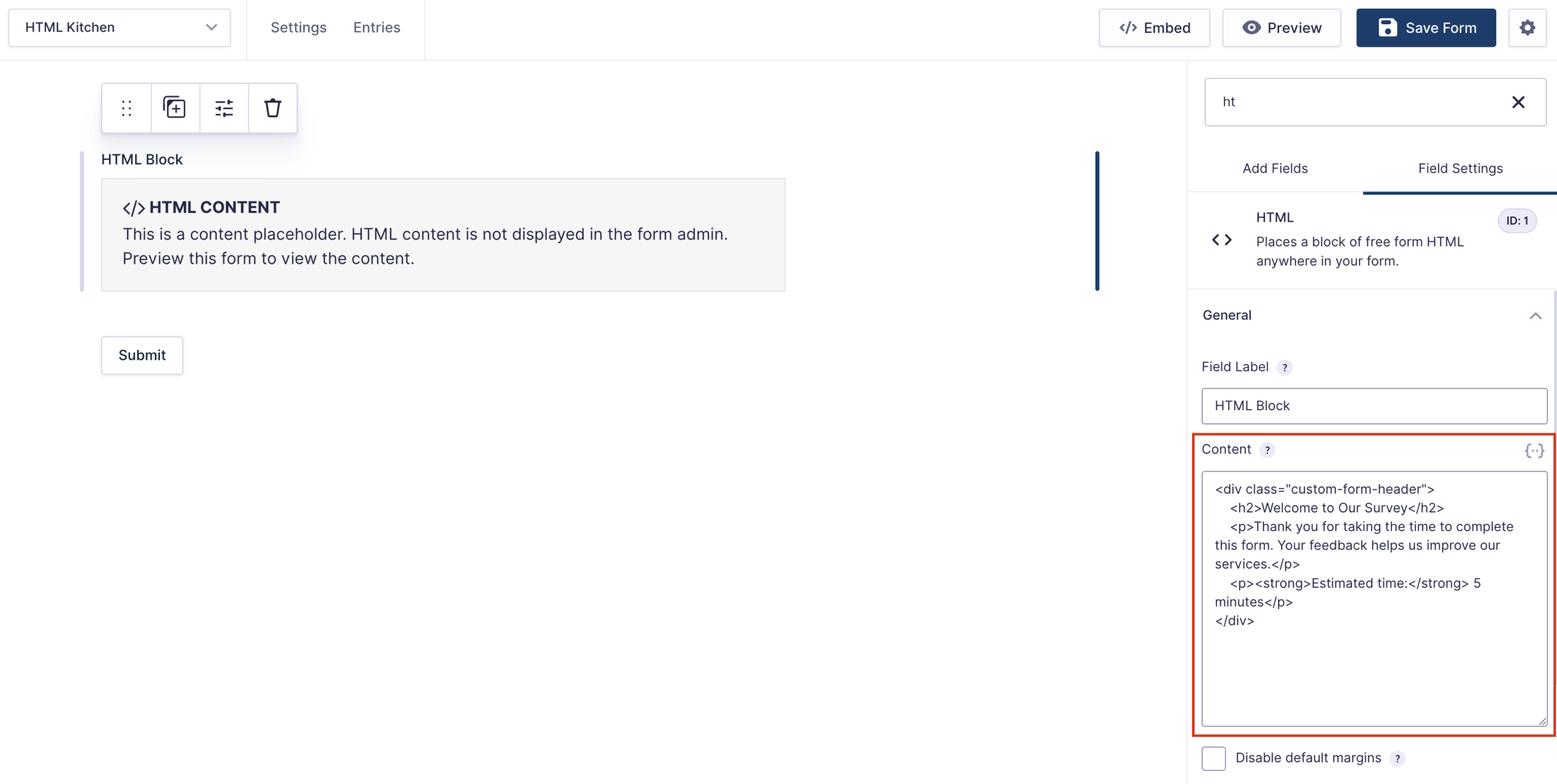 - Click on the HTML field to open the field settings.