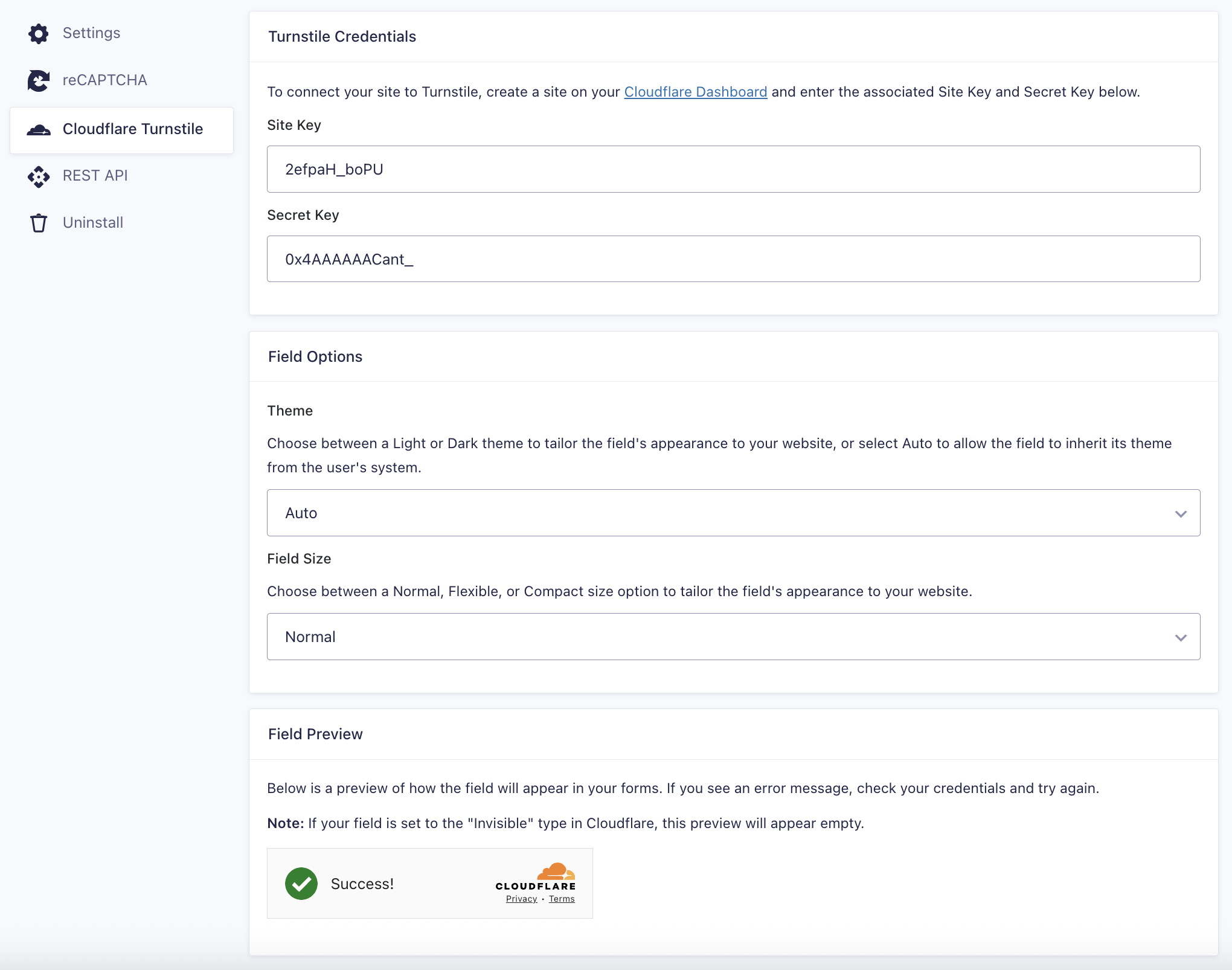 | Field Preview | Once you have saved your site key and site secret, you’ll see a preview of the Turnstile field based on your settings. See note (3). |