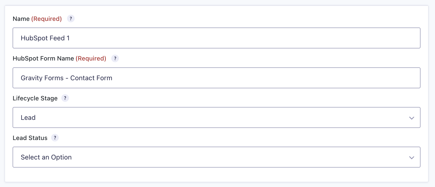 | HubSpot Form Name | Name of the form that will be automatically created in your HubSpot account to work with this feed. Once created, that form should not be edited or removed. Required. |