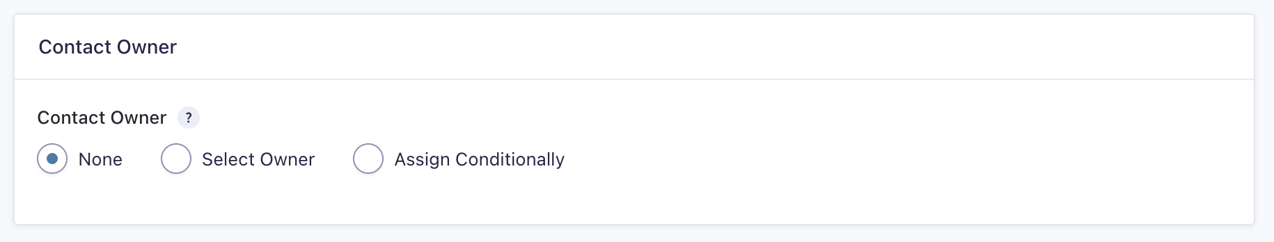 | Contact Owner | Choose form options: None–contact will be unassigned when created. Select Owner–automatically assigns the contact to a specific HubSpot user. Assign Conditionally–set specific conditions for assigning the owner. |