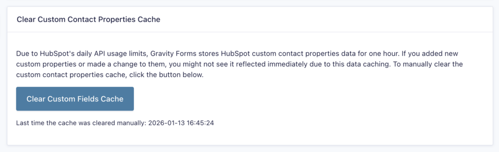 To force update this cache, go to Forms → Settings → Hubspot and click the “Clear Custom Field Cache” button.