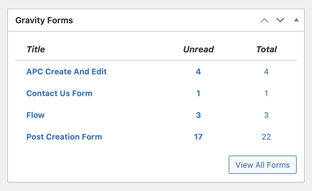 The dashboard widget is installed automatically when you activate Gravity Forms and can be accessed from the WordPress Dashboard. You can quickly see which forms have unread entries, how many unread entries, and the total number of entries per form. Clicking the form name or the number of entries will take you to the Entries screen for that form.
