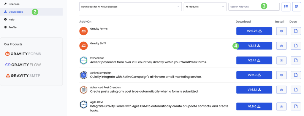 To download an Add-On, you must be have at least one active Gravity Forms license of the appropriate level. To see which Add-Ons are available with your license type, review our Add-Ons page. If you own multiple license types, you will have access to downloads based on the highest level of active license you own.