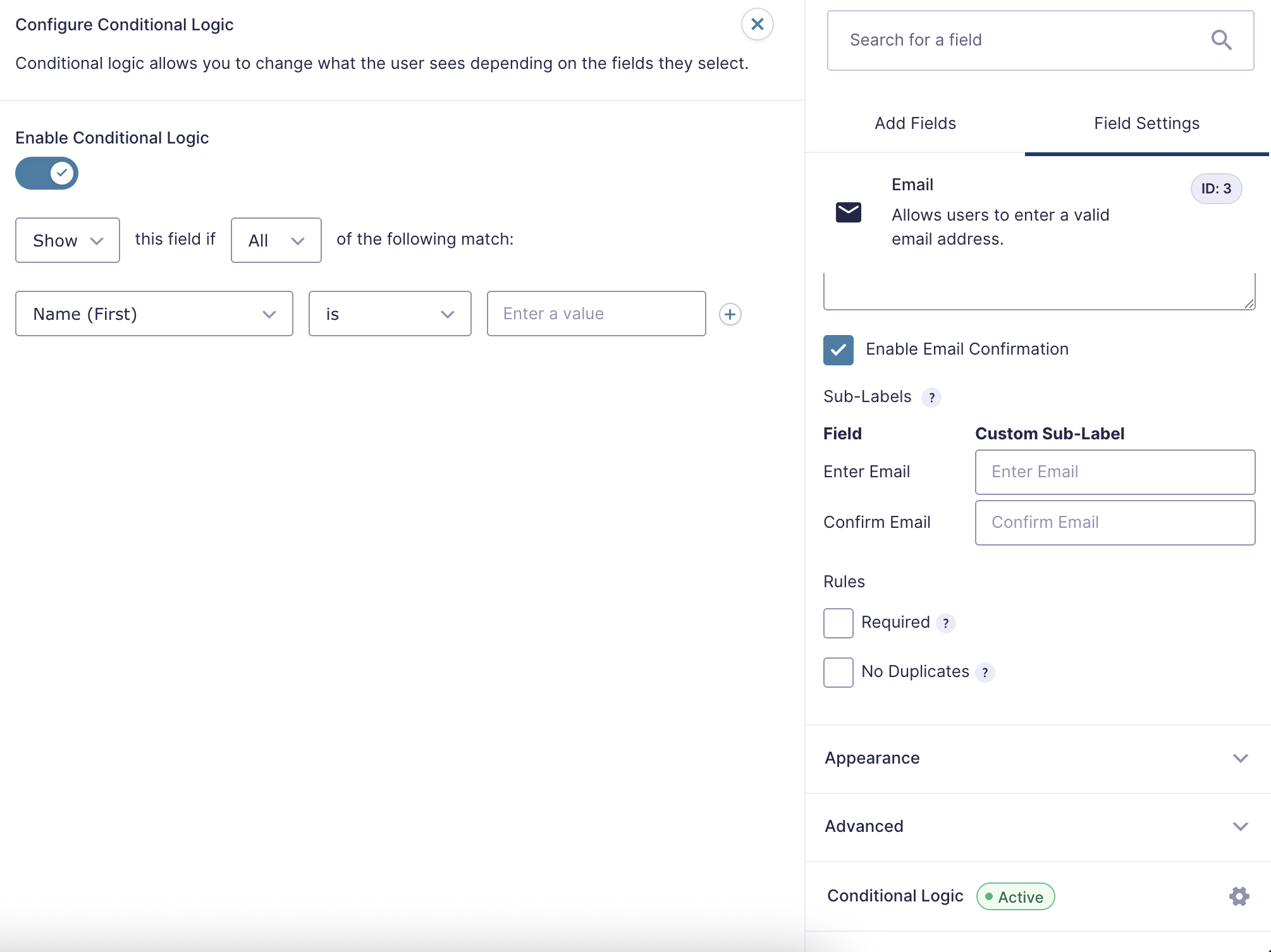 Within the fly-out, you should see a toggle labeled Enable Conditional Logic. If you click the toggle on, the options to conditionally display or hide this field will be shown.
