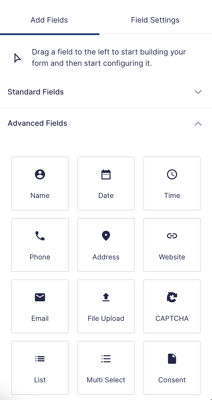 Advanced Fields are more advanced form field types with specific usage in mind. Advanced fields may actually contain multiple fields in one container. These fields make it easy to capture data such as a users Name, Address, etc.