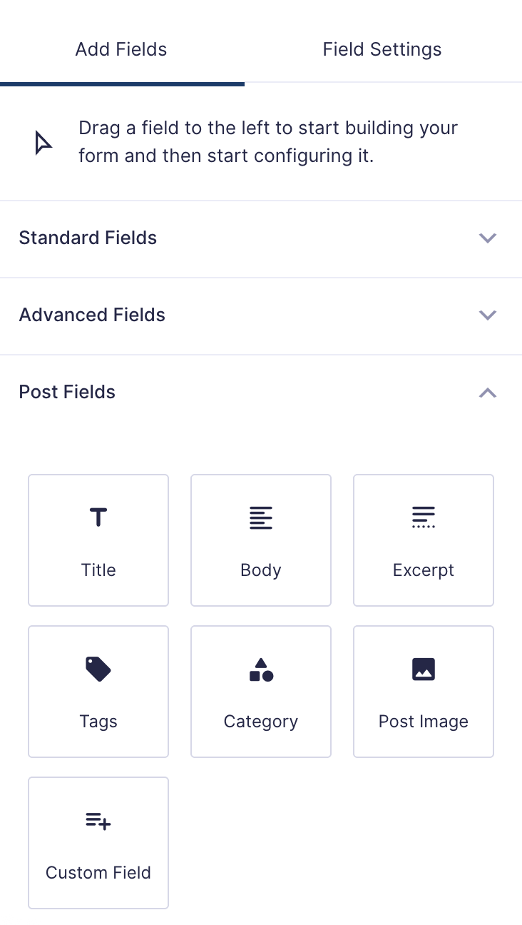 Post Fields are form fields that enable you to capture data that is then used to create a WordPress Post. These fields make it quick and easy for you to create forms that allow users to submit content to your site. The result posts will be set as a Draft and will need to be published before they are visible.