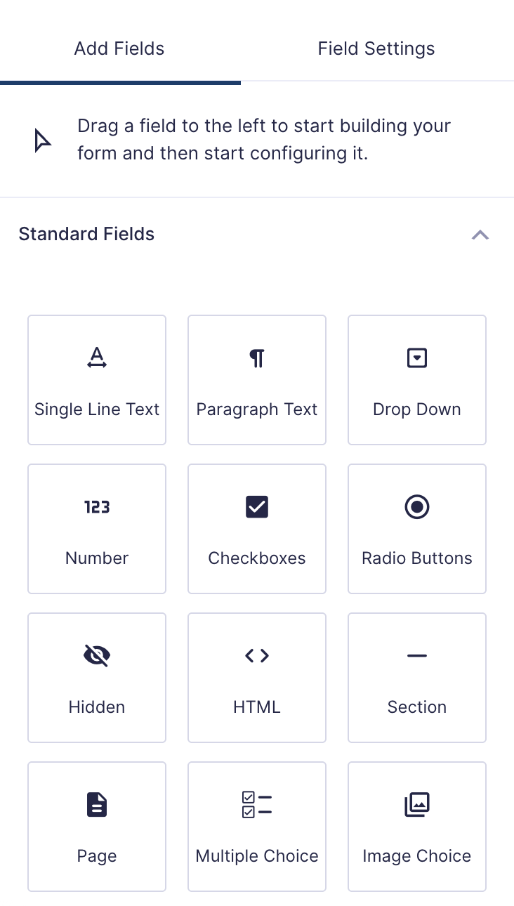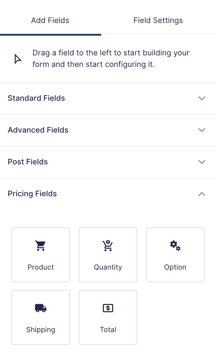 Pricing Fields are form fields that enable you to create product-focused forms. Additionally, this is where you will find add-on-specific payment collection fields, such as the Stripe Card field and the Coupons field.