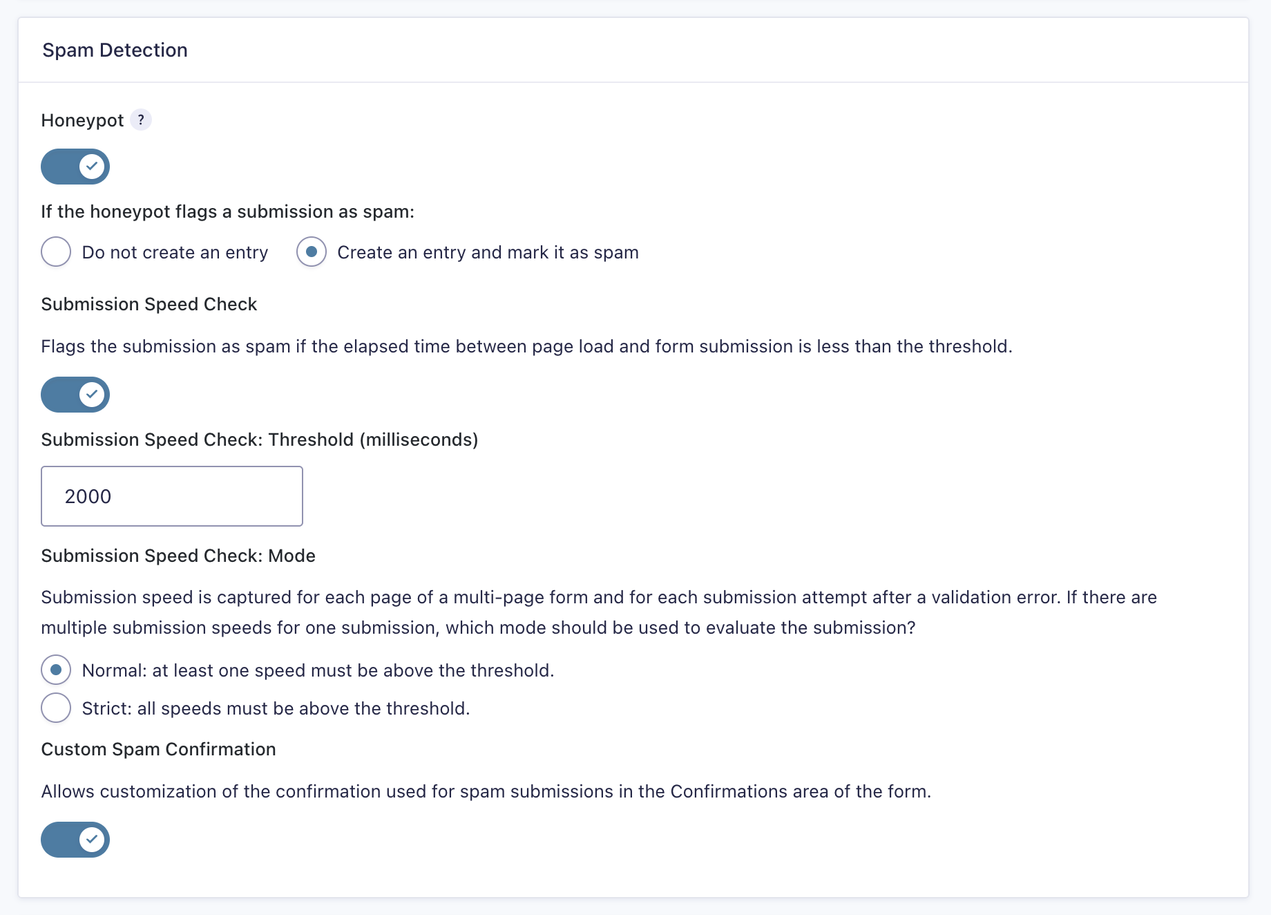 Note: Honeypot settings and Submission Speed Check settings are only visible when Honeypot is enabled.