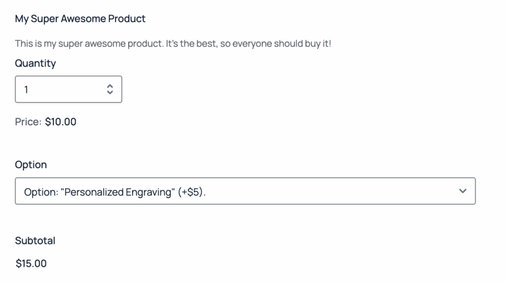 Product | My Super Awesome Product ($10 base price) | $10 |