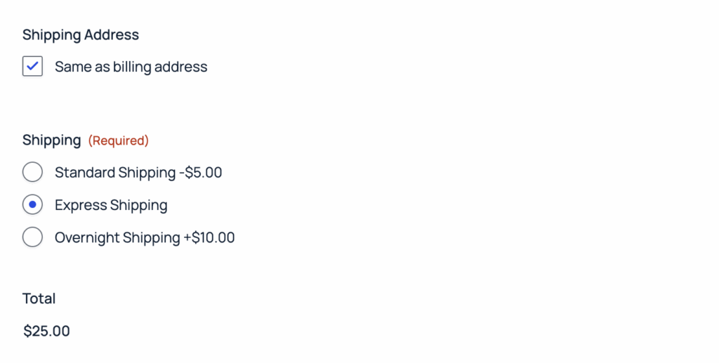 Shipping | Adds a shipping cost to the form’s total, fixed or based on user selection. | It supports single method, drop-down, or radio buttons; it links to the form’s total. |