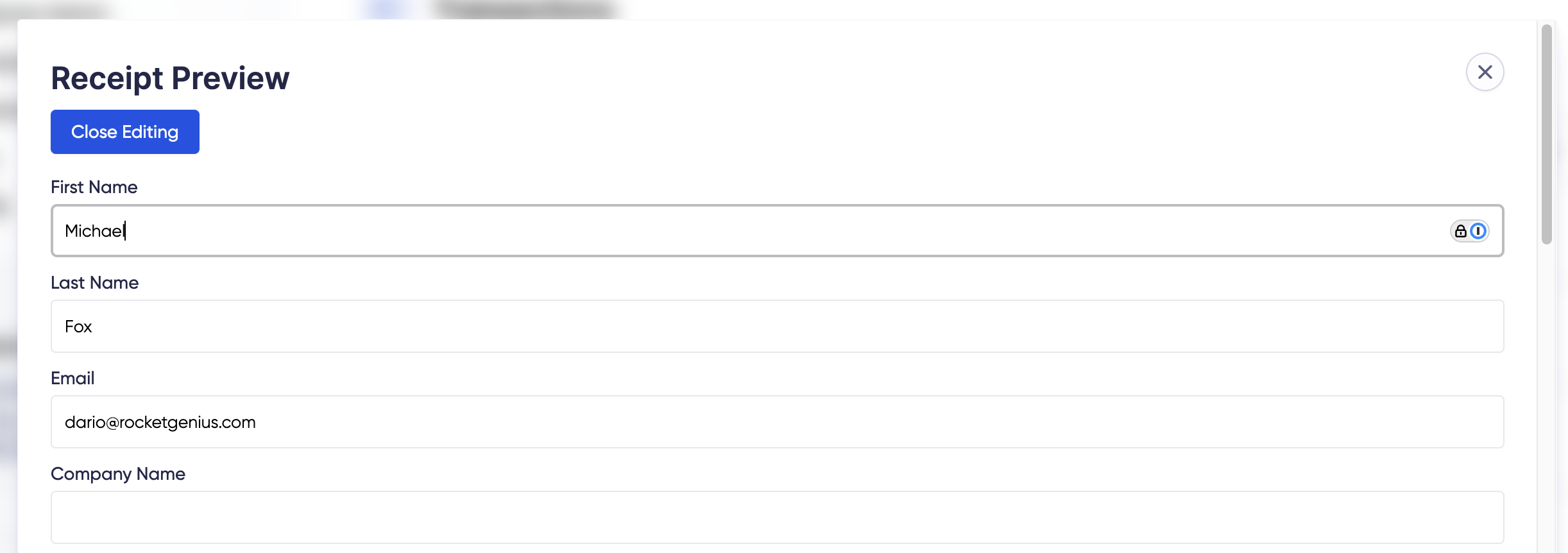 You can update the email address, first and last name, company name, address fields, and Tax ID number and type. These changes apply only to this printable receipt and won’t be saved for future sessions. When you’re done, click Close Editing to exit edit mode.