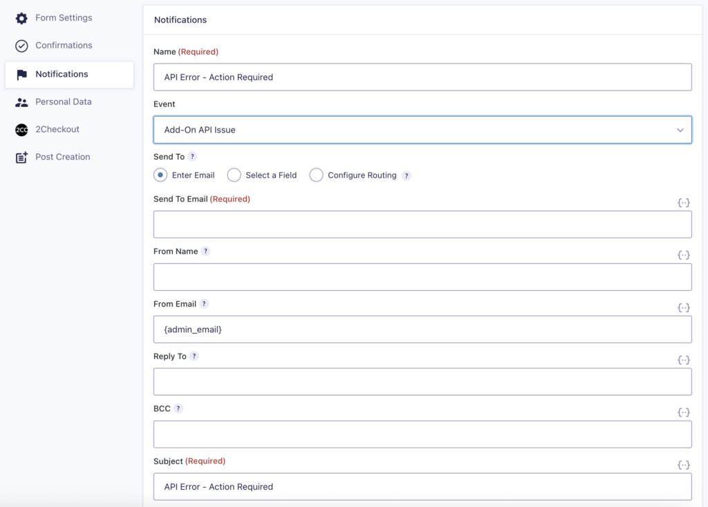Note: You can use the {all_fields} merge tag to provide context about the form submission, and the {entry_url} merge tag to create a direct link to the entry where the add-on records the specific API error in the entry notes.