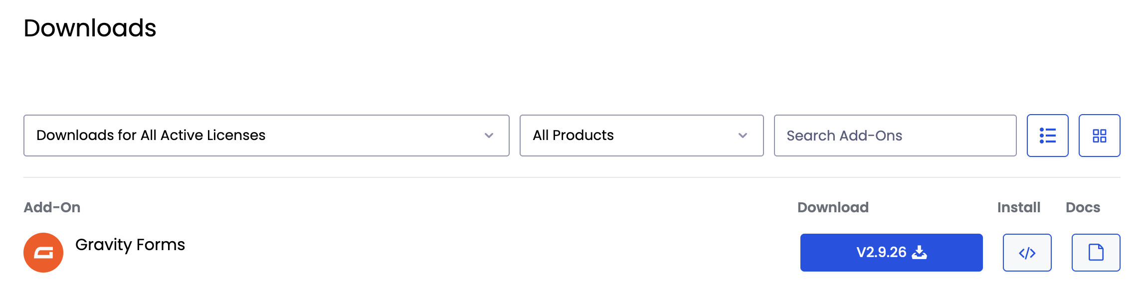 If you have an active Gravity Forms subscription, you can download available add-ons, beta releases and any included products from the Downloads section of your Account. What downloads are available to you will be dependent upon what Gravity Forms license you own.