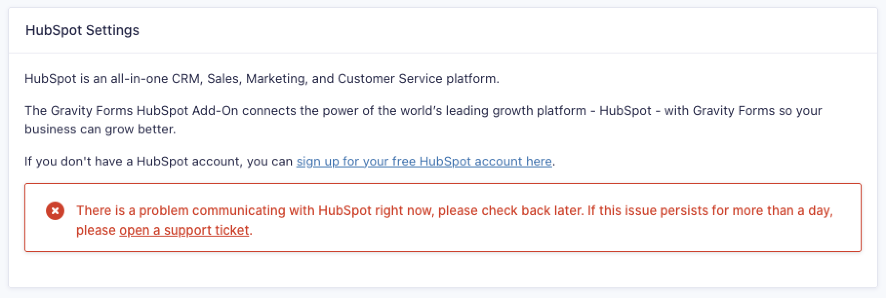 This article covers issues that can occur when attempting to connect the Gravity Forms HubSpot Add-On to your HubSpot account, and how to resolve them.