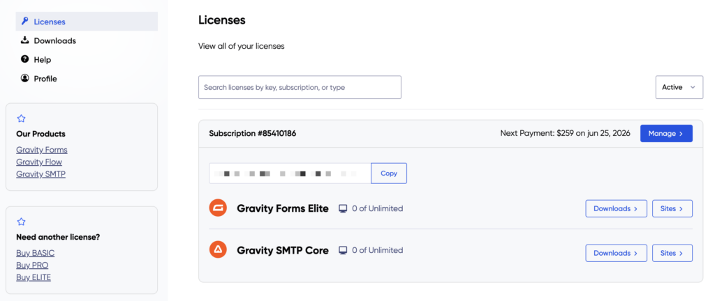 - Log into your Gravity account and go to the Licenses area.
