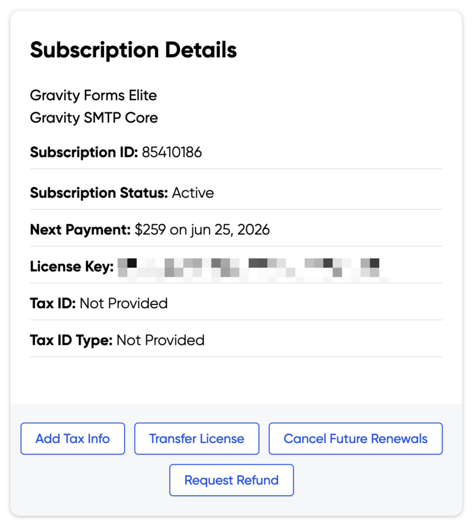 If you transfer a license to another party, all subscription information is removed from that license, which also removes all tax information.